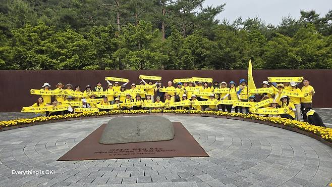 | ▲ 지난해 5월 22일, ‘노무현 순례길’ 순례자들이 봉하마을 고 노무현 대통령 묘소에서 자체 추도식을 가진 후 기념 사진을 찍고 있다. |