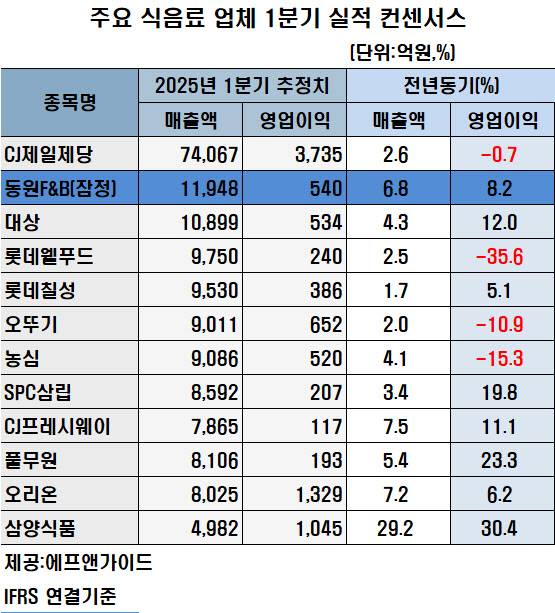 식품업계 대장인 CJ제일제당(097950)은 1분기 영업이익이 3735억원으로 전년대비 0.7% 감소했을 것으로 추정된다. 증권가에선 경기 침체로 국내외 식품 수익성이 모두 부진한데다 작년말 미국에서 발생한 토네이도로 슈완스의 디저트 생산에 차질이 생기면서 실적이 역성장한 것으로 추정했다.