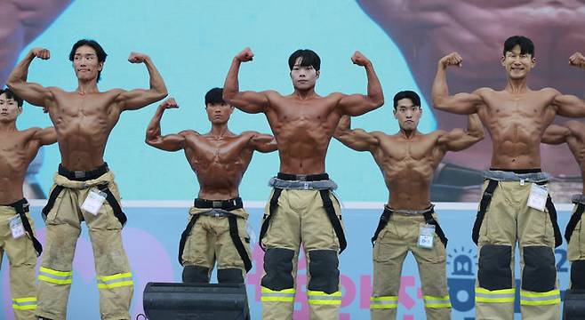 [서울=뉴시스] 강종민 기자 = 1일 서울 여의도공원에서 열린 '2025 몸짱소방관 선발대회'에서 참가 소방관들이 그동안 가꿔온 근육질 몸매를 선보이고 있다.