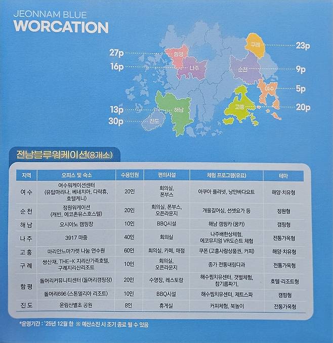 전남도는 여수, 순천, 해남, 나주, 고흥, 구례, 함평, 진도 등 8개 시·군에 블루 워케이션 8곳을 선정했다. 해양·치유형, 캠핑형, 정원형, 전통가옥형, 호텔·리조트형 등 유형도 다양하다.