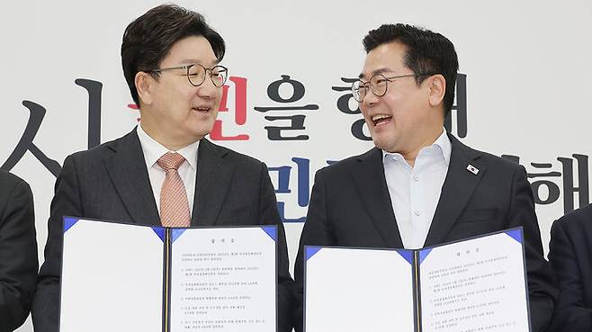 ▲ 1일 서울 여의도 국회에서 더불어민주당 박찬대 당대표 직무대행 겸 원내대표(오른쪽)와 국민의힘 권성동 원내대표가 추경안 합의문에 서명한 뒤 미소 짓고 있다.