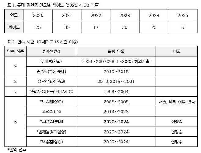 김원중이 6시즌 연속 10세이브를 달성하게 되면 역대 5번째 대기록을 수립한다. 그 전에는 구대성(전 한화, 9시즌 연속), 손승락(전 롯데, 9시즌 연속), 정우람(전 한화, 8시즌 연속), 진필중(전 LG, 7시즌 연속) 등 4명만이 달성했다. 이들 모두 KBO 리그를 대표했던 최고의 마무리 투수였다.