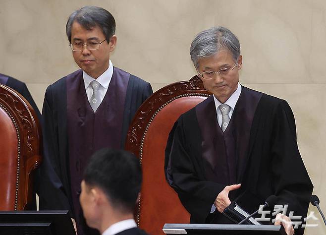 조희대 대법원장을 비롯한 대법관들이 1일 오후 서울 서초구 대법원에서 이재명 더불어민주당 대선 후보의 공직선거법 위반 사건 상고심 선고를 위해 입정하고 있다. 대법원은 공직선거법 위반 혐의로 재판에 넘겨진 이 후보에게 무죄를 선고한 2심 판결을 깨고 유죄 취지로 파기 환송됐다. 이 후보는 서울고법에서 다시 재판받아야 한다. 대법원 전원합의체(주심 박영재 대법관)는 1일 이 후보에게 무죄를 선고한 원심판결을 파기하고 사건을 서울고법으로 돌려보냈다.