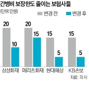 15세 이하를 대상으로 한 간병비 한도 역시 3분의 1 수준으로 쪼그라들었다. 삼성화재·현대해상·KB손해보험은 이달부터 15세 이하 어린이 대상 보장 한도를 기존 15만원에서 5만원으로 낮췄다.