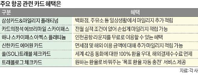 5월 황금연휴를 앞두고 항공 관련 카드를 찾는 소비자가 늘고 있다. ‘공짜 항공권’을 얻기 위해선 마일리지 적립 혜택을 주는 카드 상품을 잘 살펴보는 게 핵심이기 때문이다. 아시아나항공이 대한항공 자회사로 편입된 가운데 아시아나항공 제휴 신용카드들이 시장에서 사라지며 마일리지 적립 카드의 희소성이 커진 점이 반영됐다. 무료 수수료 등 혜택을 내세운 ‘트래블 카드’도 꼼꼼하게 살펴볼 필요가 있다.