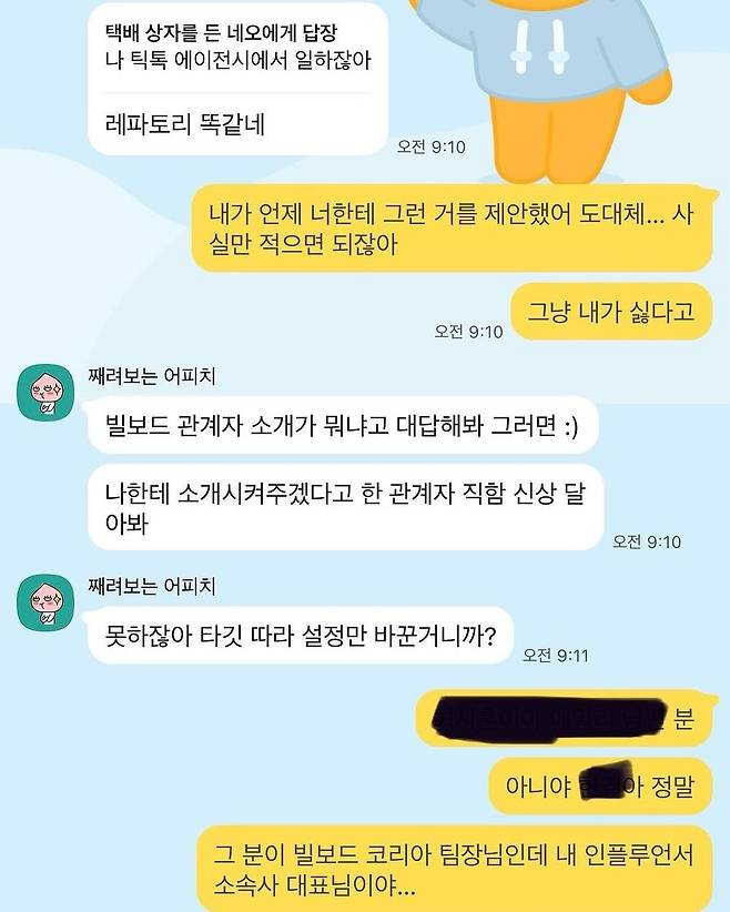 리원은 공개한 카톡에서 관련 인물을 마스킹으로 가렸으나, 누리꾼들은 해당 사진의 밝기를 올리며 관련 인물을 추측했다. 그 결과 가려진 부분이 "최시훈이야. 에일리 남편 분"이라는 것이 드러났다. 최근 에일리와 결혼식을 올리고 신혼여행 중인 최시훈에게도 불똥이 떨어진 것. 이후 최시훈이 실제 빌보드 코리아에서 일을 하는지, 리원 소속사 대표인지 등의 진위 여부에 대해 말들이 쏟아지고 있다.