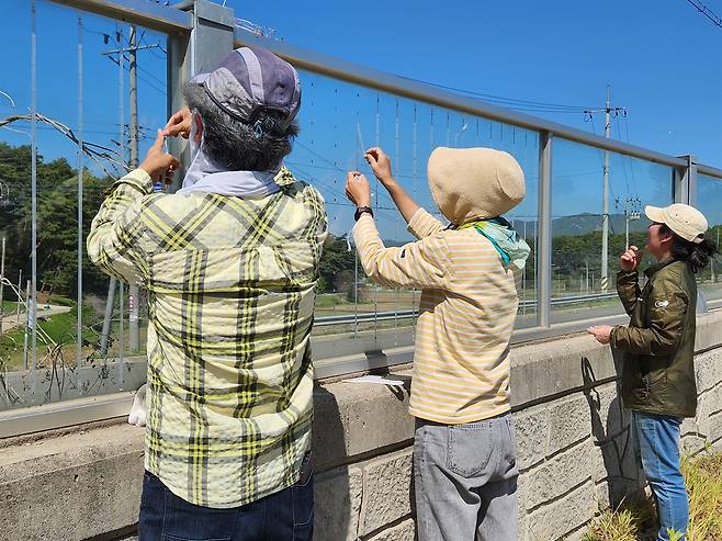 충남 예산홍성환경운동연합 회원들은 새들의 죽음을 두고만 볼 수 없다며 지난 2021년부터 홍성과 청양을 잇는 29번 국도 주변의 방음벽에 조류충돌 방지 스티커를 붙이고 있다. 지난 4월 30일 예산홍성환경운동연합 회원들과 활동가들은 29번 국도 암소고개 교차로 부근에서 조류충돌방지 스티커 부착 작업을 진행했다.