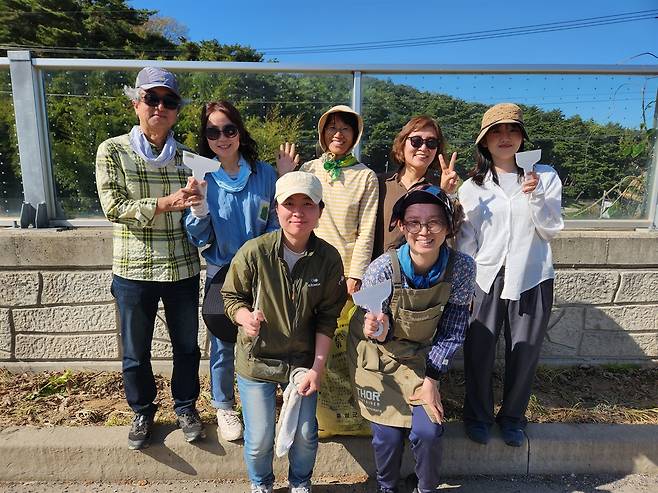 | ▲ 조류충돌 방지 스티커 부착 작업을 마무리하고 기념 촬영 중인 예산홍성환경운동연합 활동가와 회원들 |