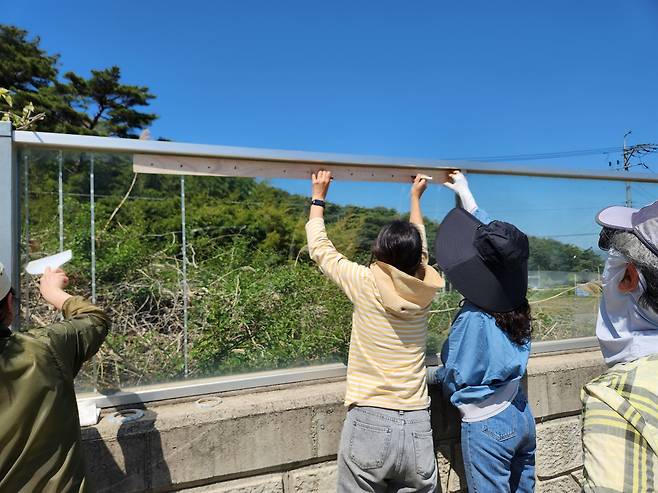 회원들이 이날 붙인 스티커는 이른바 '5˟10cm 규칙'이 적용됐다. 5˟10cm 간격으로 붙인 스티커는 새들에게 그물 혹은 장애물로 인식된다. 새들이 스티커와 스티커 사이의 좁은 공간을 장애물로 인식해 회피하게 하는 것이다.