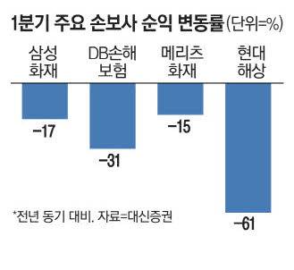 대신증권은 1일 주요 4개 손보사(삼성화재·DB손해보험·메리츠화재·현대해상)의 지난 1분기 당기순익이 1조5830억원을 기록했을 것으로 전망했다. 전년 동기(2조2530억원)에 비해서는 30% 감소한 수준이다. 대신증권 외에도 이날까지 손보사 1분기 실적을 예측한 대부분 증권사가 주요 4개사에 대해 30% 안팎의 당기순이익 감소를 예상했다.