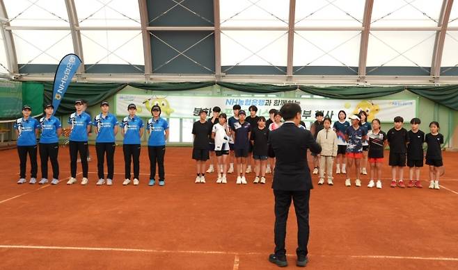 <사진> 소프트테니스 명문 구단 NH농협은행 선수단이 경북 봉화에서 꿈나무를 대상으로 재능기부를 했다. NH농협은행 제공