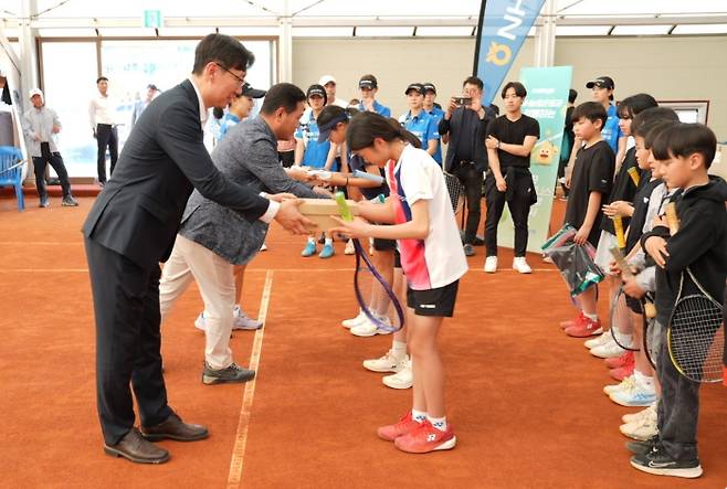 농협은행 선수단은 재능기부를 마친 뒤 신발, 운동복, 양말, 유니폼 등 1400만 원 상당의 물품을 참가자들에게 전달했습니다.