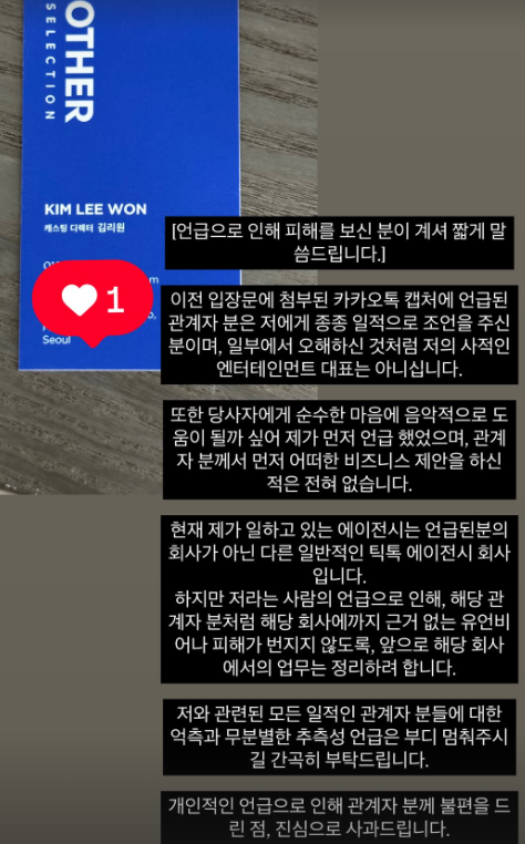 1일 리원은 자신의 SNS를 통해 "이전 입장문에 첨부된 메신저 캡처에 언급된 관계자분은 저에게 종종 일적으로 조언을 주신 분이며, 일부에서 오해하신 것처럼 저의 사적인 엔터테인먼트 대표는 아니다"라고 부인했다.