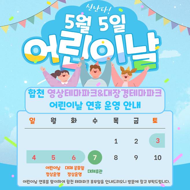 합천군은 5월3일부터 6일까지 어린이날 연휴에 합천영상테마파크와 대장경테마파크를 정상 운영한다.