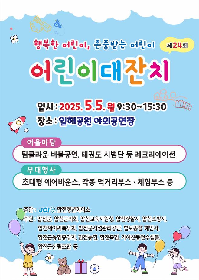 제103회 어린이날을 맞아 5월5일 일해공원 야외공연장에서 식전공연을 시작으로 합천군 제24회 어린이 대잔치가 개최된다.