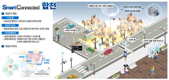 합천군은 이번 공모에서 지역 여건과 군민 생활에 기반한 맞춤형 전략을 수립하고, 생활 밀착형 스마트 기술 4가지를 집중 제안해 좋은 평가를 받았다. 군민 안전과 생활편의를 위한 스마트 솔루션 4종 스마트폴(Smart Pole), 스마트 주차 공유 시스템, 계류형 드론 기반 스마트 산불 감시 시스템, 스마트 생활 관광 키오스크를 2026년 7월까지 도입할 계획이다.