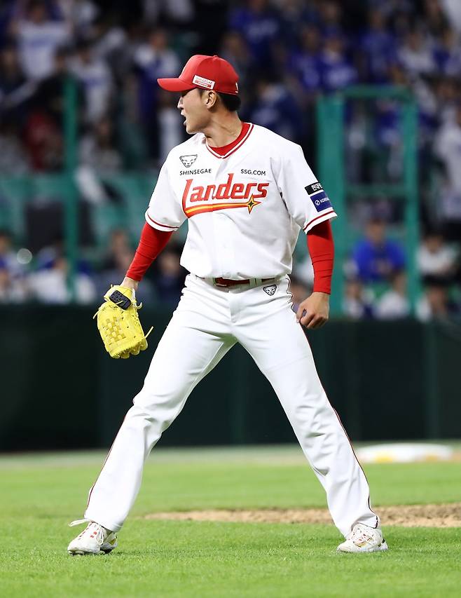 SSG는 삼성과 6-6으로 팽팽하게 맞선 11회초 여덟 번째 투수로 좌완 김건우를 호출했다. 김건우는 심재훈과 이재현을 유격수 땅볼 처리한 뒤 김성윤, 구자욱에게 각각 안타와 볼넷을 내줬다. 2사 1·2루에서는 르윈 디아즈에게 삼진을 솎아낸 뒤 주먹을 불끈 쥐며 포효했다.