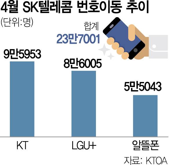 SK텔레콤은 이달 유심 500만 개, 다음 달 500만 개를 확보한다고 밝힌 바 있어, 최소한 1~2개월간 신규 가입이 중단될 것으로 보인다. 이 경우 SK텔레콤의 가입자 이탈 규모도 가속화 할 것으로 전망된다. 한국통신사업자연합회(KTOA)가 1일 발표한 번호이동 통계에 따르면 지난달 SK텔레콤에서 다른 통신사로 이동한 고객은 23만7001명이다. 이는 전월 대비 87.7% 늘어난 수치로 이 중 9만 여명은 해킹사고 소식이 본격적으로 전해진 지난달 26일 이후 통신사를 바꿨다. SK텔레콤이 초기 해킹 사고 신고를 지연하고, 고객 안내를 소홀히 하는 문제가 발생하면서 많은 이용자들이 통신사를 바꾸는 선택을 한 것으로 보인다. 4월 SK텔레콤에서 번호이동을 한 이용자 중 9만5953명은 KT로, 8만6005명은 LG유플러스로 향했다. 알뜰폰으로 빠져나간 이들도 5만5043명에 이른다.
