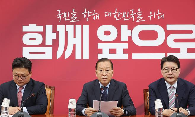 | “법치의 철퇴” 국민의힘 권영세 비상대책위원장(가운데)이 1일 서울 여의도 국회에서 더불어민주당 이재명 대선 후보의 공직선거법 상고심이 유죄 취지로 파기환송된 것과 관련해 기자회견을 하고 있다. 연합뉴스 |