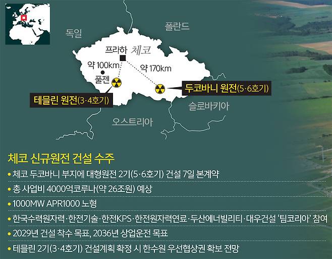한수원 컨소시엄이 수주한 두코바니 신규 원전은 체코 현대사에서 최대 규모 사업이다. 한국 측은 원전 4기를 운영 중인 두코바니에 1000㎿급 원전 5·6호기를 건설하게 된다. 사업비는 4000억코루나(약 26조2000억원)로 추정된다. 한국은 설계, 기자재 공급, 건설과 시운전, 핵연료 공급 등 원전건설 역무 전체를 일괄 공급한다.