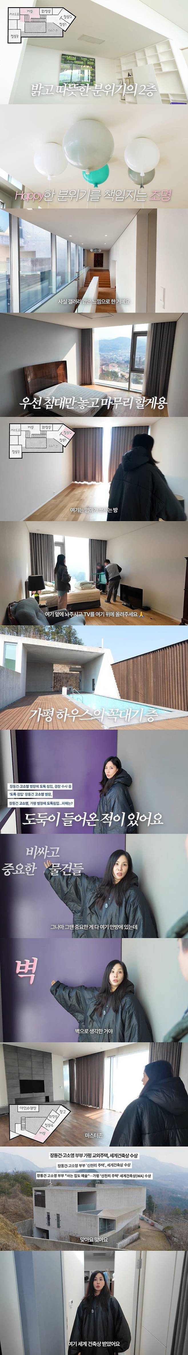 이날 고소영은 3층 가평집 하우스를 공개했다. 고소영의 취향이 가득 들어간 집에 제작진은 "집 너무 좋다"며 감탄, 고소영은 "세계 건축상 받았다"며 집을 소개했다.