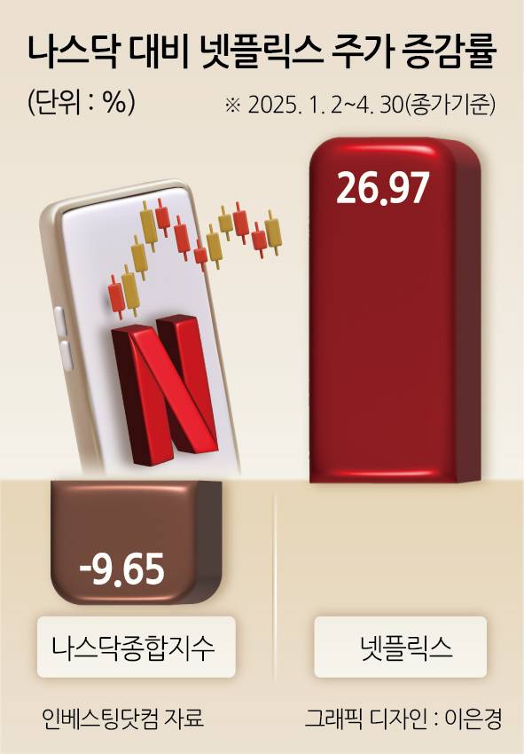 본격적인 관세가 시행된 4월에만 넷플릭스 주가는 21.36% 뛰었는데, 이는 나스닥 종합지수가 0.85% 소폭 오른 것과 크게 대비되는 성적표다.