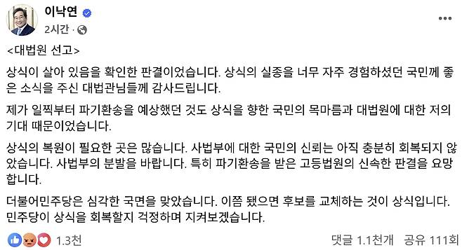 이 상임고문은 페이스북에 올린 입장문에서 “오늘 대법원 선고는 상식이 살아있음을 확인한 판결로, 상식의 실종을 자주 경험했던 국민께 좋은 소식을 준 대법관들께 감사하다”고 말해.