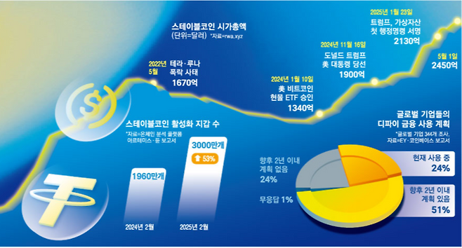 업계 전문가들은 스테이블 코인의 영향력 확대를 거스를 수 없는 대세로 받아들이고 있다. 크립토닷컴의 한국총괄 패트릭 윤은 “2024년 스테이블 코인 시장이 27조 달러 규모로 비자와 마스터 거래량을 합친 것보다 더 크다”며 “디지털과 전통금융의 경계가 흐려지고 있다”고 진단했다.