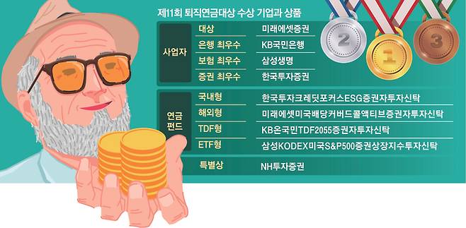 연금펀드 부문 최우수상은 국내형에 한국투자신탁운용의 ‘한국투자크레딧포커스ESG증권자투자신탁’, 해외형에 미래에셋자산운용의 ‘미래에셋미국배당커버드콜액티브증권자투자신탁’, TDF형에 KB자산운용의 ‘KB온국민TDF2055증권자투자신탁’, ETF형에 ‘삼성KODEX미국S&P500증권상장지수투자신탁’이 각각 수상 펀드로 선정됐다.