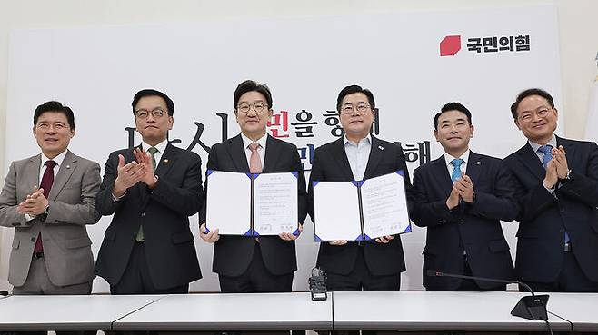 ▲ 1일 국회에서 더불어민주당 박찬대 당 대표 직무대행 겸 원내대표와 국민의힘 권성동 원내대표가 추경안 합의문에 서명한 뒤 기념촬영하고 있다.