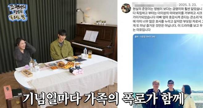 '폭싹 속았수다' 이후 가족 간의 비하인드도 공개됐다. 조현아는 "아버님이 너 (SNS에) 자주 올리시던데?"라고 언급했고, 이준영은 "내 기념일마다 올리신다. 내가 먼저 올려야 하는데 아빠가 먼저 올리신다"라고 답해 웃음을 자아냈다. 그러면서도 "예전에는 '아버지가 왜 예전 사진을 올리실까'라고 부끄러웠다. 그런데 '폭싹' 이후 가족애가 올라와서 그런지 뭉클하더라"라고 속내를 전했다.