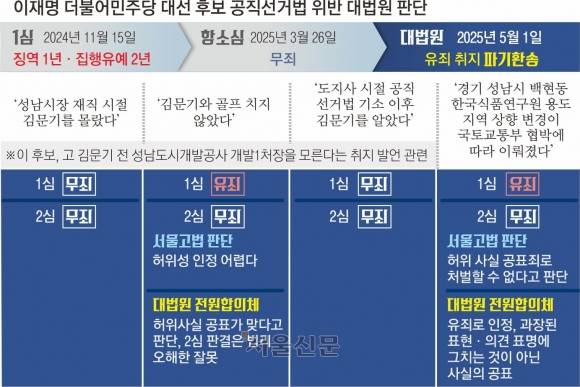 대법원 전원합의체가 1일 이재명 더불어민주당 대선 후보의 공직선거법 위반 사건을 유죄 취지로 파기환송한 것은 이 후보가 지난 대선 과정에서 한 발언이 ‘선거인(국민)의 정확한 판단을 그르칠 정도의 허위 사실’이라고 판단했기 때문이다.
