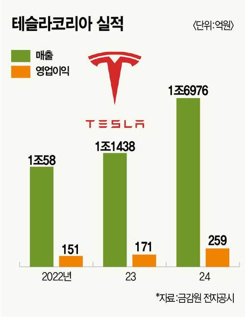 테슬라코리아 감사보고서에 따르면 테슬라코리아의 지난해 매출은 1조6976억원으로 전년(1조1438억원) 대비 48.3% 증가했다. 영업이익은 259억원, 순이익은 216억원을 기록해 각각 51.1%, 80.7% 증가하면서 매출, 수익성 모두 우상향 곡선을 그렸다.