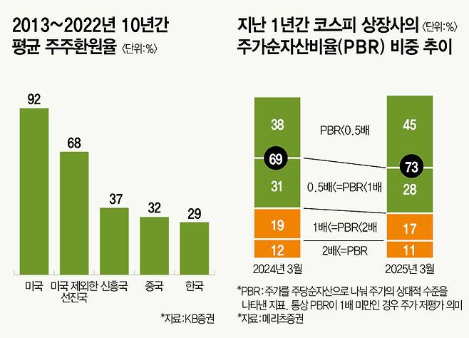국내 증시가 글로벌 증시 대비 저평가됐다는 핵심 지표가 주가순자산비율(PBR)이다. 주가를 장부 가치로 나눈 수치다. PBR이 1배 미만이면 회사가 보유 자산을 전부 매각하고 사업을 접을 때보다 현 주가가 싸다는 뜻이다. 코스피 PBR(12개월 선행)은 0.79배다. 우리나라 상장 기업 자산을 처분했을 때 얻는 돈이 시가총액보다 많다. 심지어 이전 저점인 2024년 8월 0.8배보다 낮아졌다. 미국(4배), 일본(1.4배)에 비해 한참 아래다.