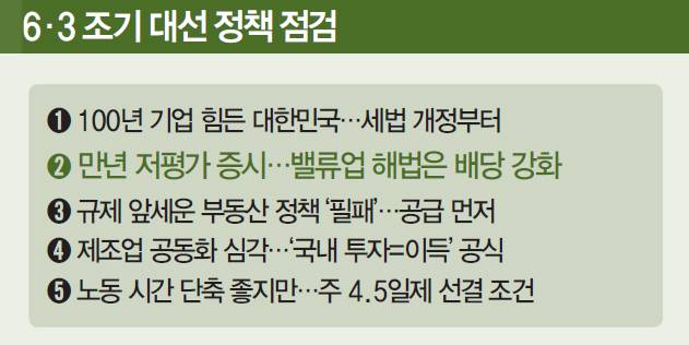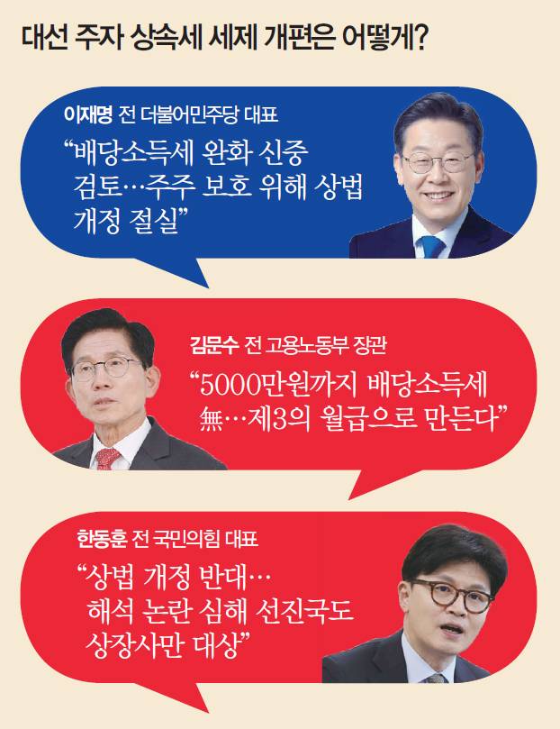 유력 대선 후보인 이재명 전 더불어민주당 대표는 ‘코스피 5000 시대’를 외친다. 2022년 대선 때 내세웠던 공약을 다시 내놓았다. 이 후보는 스스로를 ‘꽤 큰 개미 중 하나’였다고 자처할 만큼 주식 투자 실무에 밝다. 그는 최근 금융투자협회를 찾아 “정치를 그만두면 주식 시장으로 돌아갈 가능성이 99%”라며 “대선에서 떨어져 상당 기간 정치를 안 할 것 같아 나름 연구해 조선주를 샀다 국회의원이 되는 바람에 (팔았는데) 지금은 3배가 올랐다”고 밝히기도 했다. 한국 증시 저평가 해소는 해묵은 숙원과제지만 실현 방법은 제각각이다. 핵심 이슈는 배당소득세 개편, 상법 개정, 자사주 소각 등 밸류업 프로그램이다.