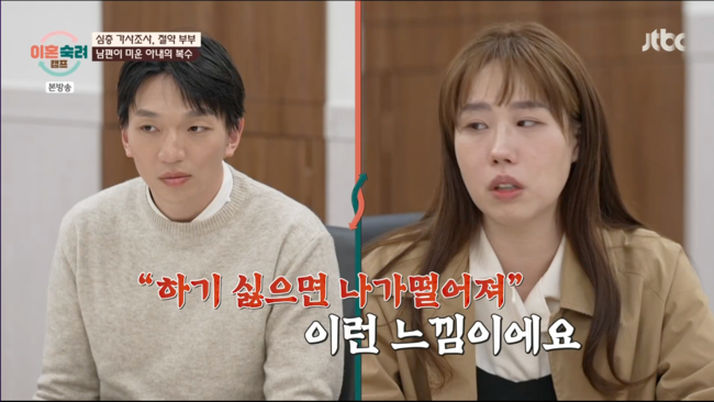 남편은 아내의 문제점에 대해 세세한 통제에 보고는 필수라는 점을 밝히기도. 남편은 “보고 안 하냐 이런 식으로 말하는 게 짜증이 난다”라고 덧붙였다. 아내는 “’하기 싫으며 나가 떨어져’ 이런 느낌이다”라고 밝혀 모두를 놀라게 만들었다.