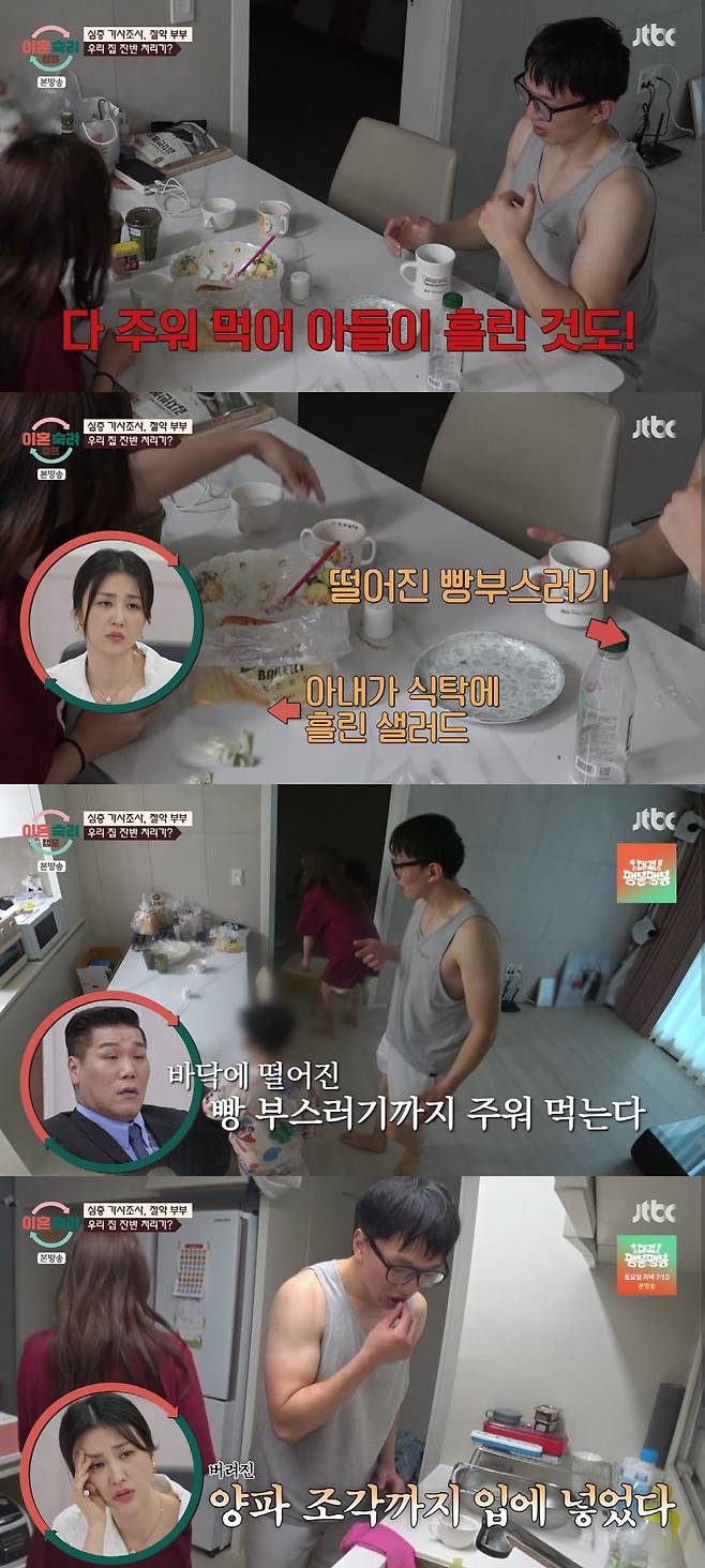 남편 측의 증거 영상은 여기서 끝이 아니었다. 진태현은 "이걸 보다가 제가 다 경악스러웠다"라고 말해 궁금증을 자아냈다. 아내는 남편을 '잔반처리기'라 부르며 남은 음식을 강요해 먹이기도 했다. 남편은 "아내 기준이 너무 빡세다. 밥풀 뿐만 아니라 그릇에 있는 김가루, 고춧가루 티끌도 용납이 안 된다"라고 했다. 이를 증명하 듯, 아내는 남편에게 식탁에 흘린 샐러드 조각, 바닥에 떨어진 빵 부스러기, 설거지통에 있던 양파 부스러기까지 다 주워 먹으라고 강요했다.