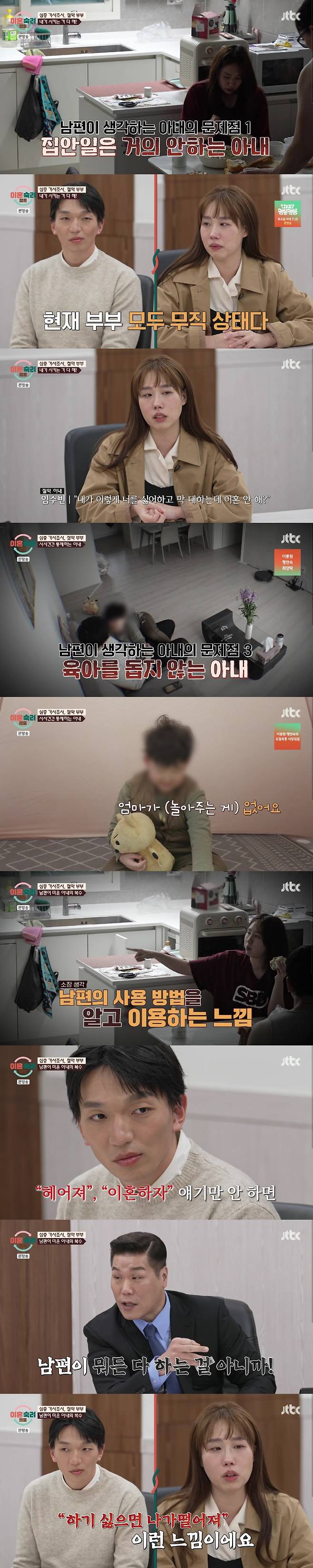 서장훈은 "남편이 딱하다. 솔직히 말하자면 거의 머슴 아니냐"라고 했고, 아내는 "제가 더 딱하다. 저는 모든 걸 다 잃었다. 그게 싫으면 이혼해줬으면 좋겠다"라고 울먹였다.