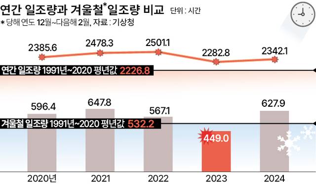 기상청에 따르면 2023년 12월∼2024년 2월 일조량은 449시간으로, 이전 해 같은 기간보다 무려 118시간 적었다. 1991년부터 2020년까지 나온 평년값보단 83시간 적은 수치로, 이는 1973년 관측 이래 세번째로 낮은 양이다.