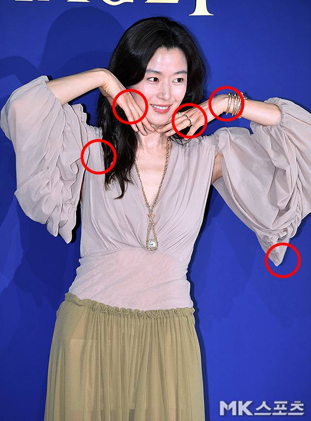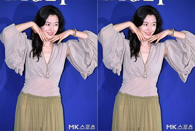 이날 행사에서 전지현은 은은한 베이지 컬러의 블라우스에 올리브 컬러의 시스루 롱스커트를 매치하고 포토월 무대에 올라 보는 이의 시선을 단번에 사로잡았습니다.