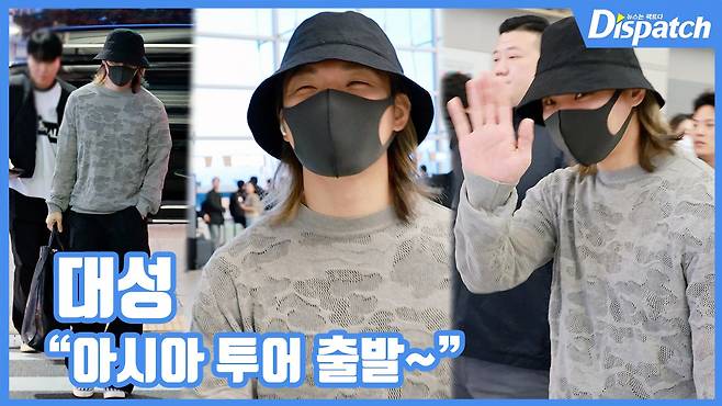 이날 대성은 블랙 앤 그레이 룩으로 무채색의 미니멀한 공항패션을 선보였다.