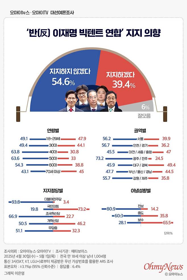 <오마이뉴스>·<오마이TV>가 여론조사기관 메타보이스에 의뢰해 지난 4월 30일(수)부터 5월 1일(목) 이틀 간 전국 만 18세 이상 성인남녀 1004명(응답률 6.4%)을 대상으로 "만약 이번 대통령선거에서 국민의힘 후보와 한덕수, 이준석, 이낙연 등이 참여하는 반이재명 빅텐트 연합'이 결성된다면 귀하께서는 지지하겠나. 지지하지 않겠나"라고 물었다.