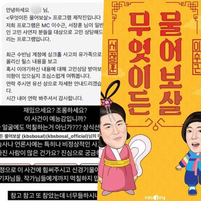 [OSEN=김수형 기자] 서울 강동구 싱크홀 사고 유가족에게 섭외 요청을 한 KBS Joy 예능 ‘무엇이든 물어보살’ 제작진의 행보가 여론의 뭇매를 맞고 있다. 유족의 고통을 소재로 활용하려는 듯한 접근은 예능 제작 현장에서 반드시 지켜야 할 윤리적 책임감이 무너진 사례라는 지적이다.