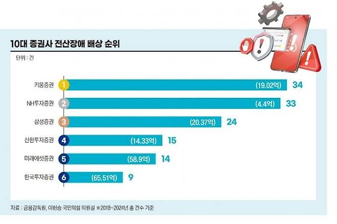 문제는 돈을 가장 많이 쓰는 증권사임에도 품질은 최하위 수준이라는 점이다. 금융감독원 자료에 따르면 최근 7년간 국내 자기자본 상위 10대 증권사에서 발생한 전산장애 배상 건수는 총 164건. 이 중 20.7%인 34건이 키움증권에서 발생해 배상 건수 1위를 기록했다.