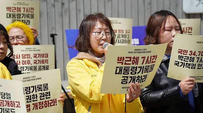 | ▲ 세월호참사 11주기, 박근혜 7시간 대통령기록물 정보공개청구 기자회견 세월호참사 11주기를 맞아 대통령기록물에 대한 정보공개청구를 알리는 기자회견에서 김순길 사무처장이 발언을 하고 있다. |