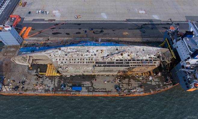 | ▲ 인양 된 세월호가 2017년 3월 31일 오전 전남 목포신항에 반잠수정에 실려 정박해 있다. |