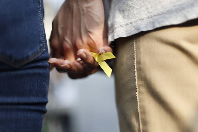 | ▲ 손을 맞잡고 있는 4.16시민 두 사람이 손을 맞잡고 있고 그 사이 노란리본이 있다. |