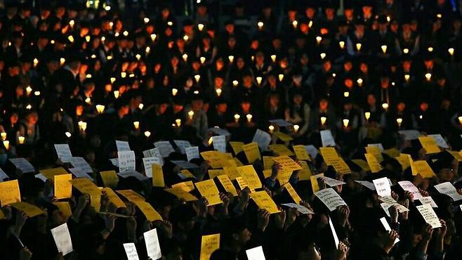 | ▲ 세월호 관련 집회에서 시민들이 촛불과 피켓을 들고 있다. 세월호 관련 집회에서 시민들이 촛불과 피켓을 들고 있다. |
