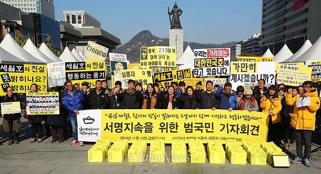 | ▲ 2014년 11월 14일 오전 서울 광화문 세월호희생자 농성장 앞에서 세월호참사진상규명을위한 범국민서명호소 기자회견이 열리고 있다. |