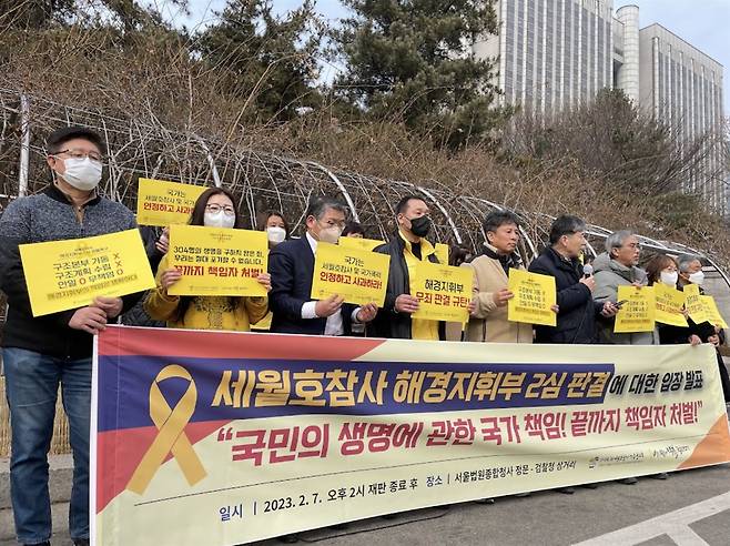 | ▲ 해경지휘부 2심 무죄선고에 대한 4.16연대와 4.16세월호참사가족협의회 입장발표 기자회견 2025년 2월 7일 해경지휘부 2심 무죄선고에 대한 4.16연대와 4.16세월호참사가족협의회 입장발표 기자회견이 고등법원 앞에서 열렸다. |